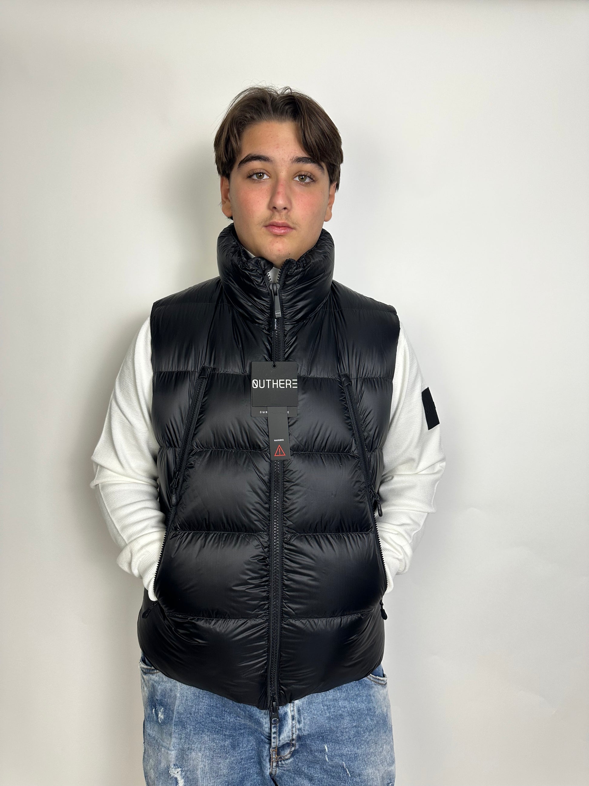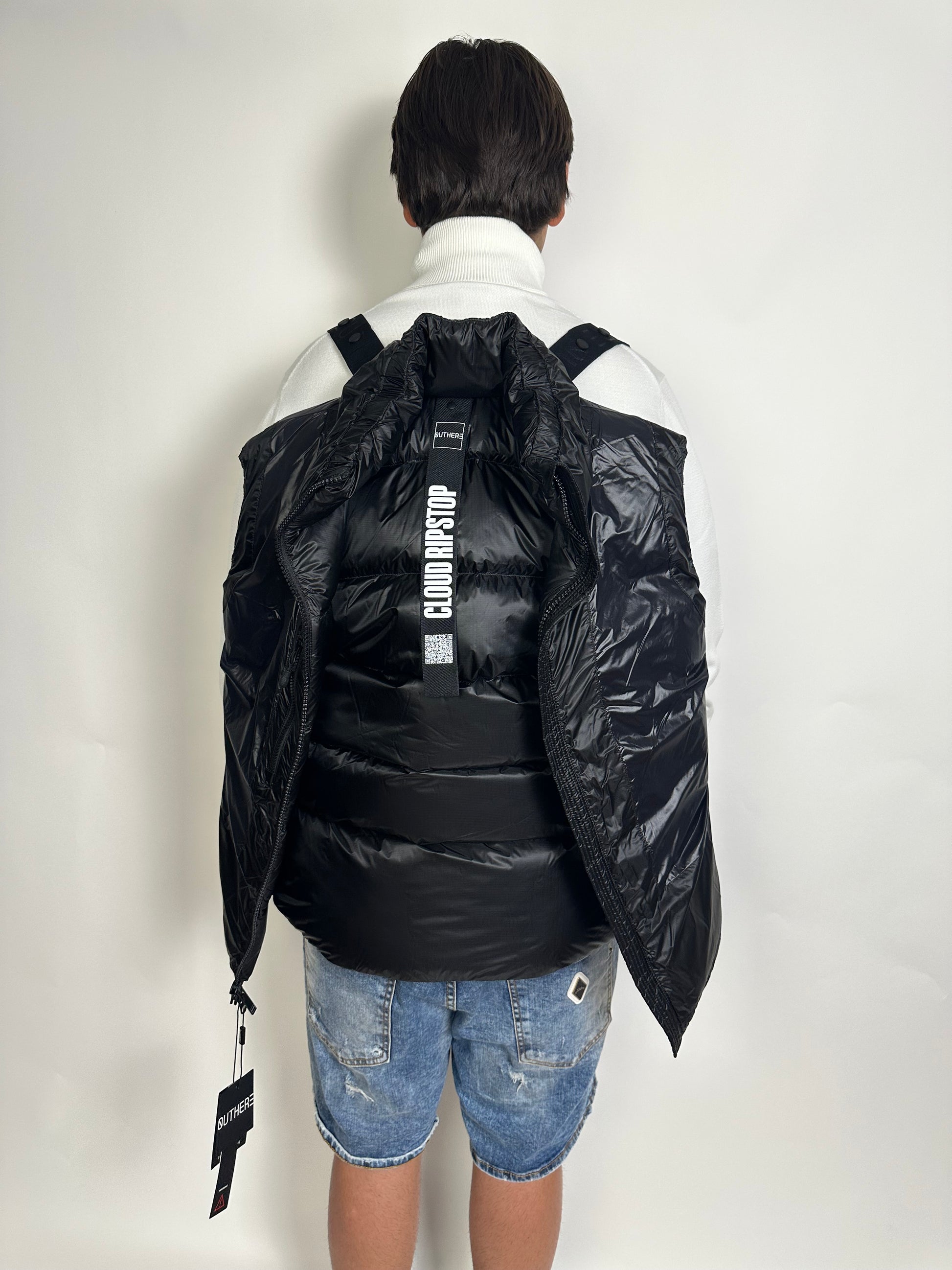 Lo Smanicato Outhere, realizzato in elegante piumino nero, è un prodotto versatile che può essere indossato come giubbino o trasformato in uno zaino. Perfetto per chi ama uno stile dinamico e funzionale, offre la massima libertà di movimento e praticità in ogni situazione.
